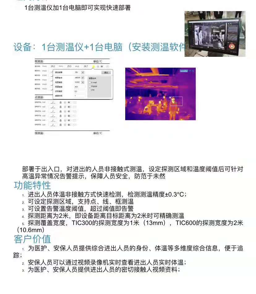 联系电话:18606282168(微信同号) 1:进出人员体温非接触方式快速检测,检测测温精度±0.3℃; 2:可设定探测区域,支持点、线、框测温 3:可设置告警温度阈值,超过阈值即告警 4:探测距离为2米,即设备距离目标距离为2米时可精确测温 5:探测覆盖宽度,TIC300的探测宽度为1米(13mm),TIC600的探测宽度为2米。