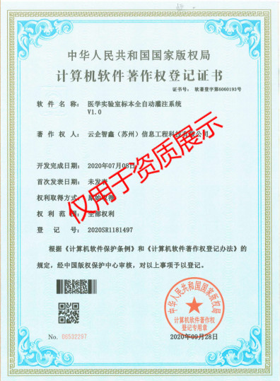 3): 医学实验室标本全自动灌注系统-V1.0-证书登记号:2020SR1181497;
